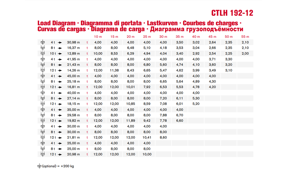 The CTLH192-12 luffing jib tower crane has a maximum capacity of 12 t and a jib tip capacity of 2.35 t with a jib length of 25-55 m.