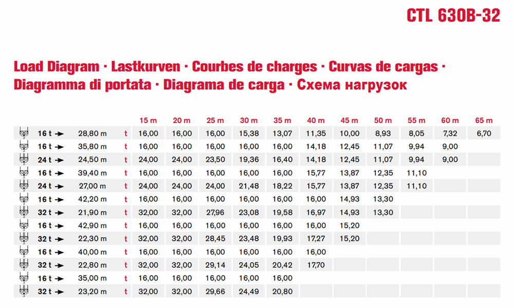 The CTL630B-32 luffing jib tower crane has a maximum capacity of 32 t and a jib tip capacity of 6.7 t with a jib length of 35-65 m.